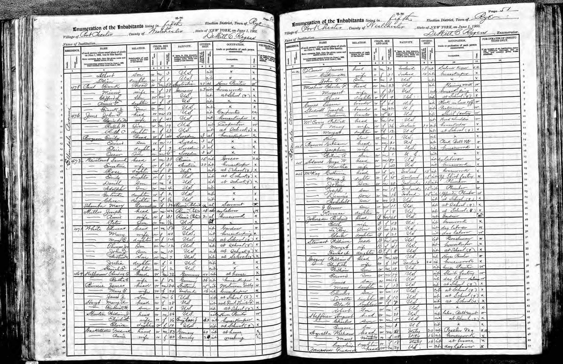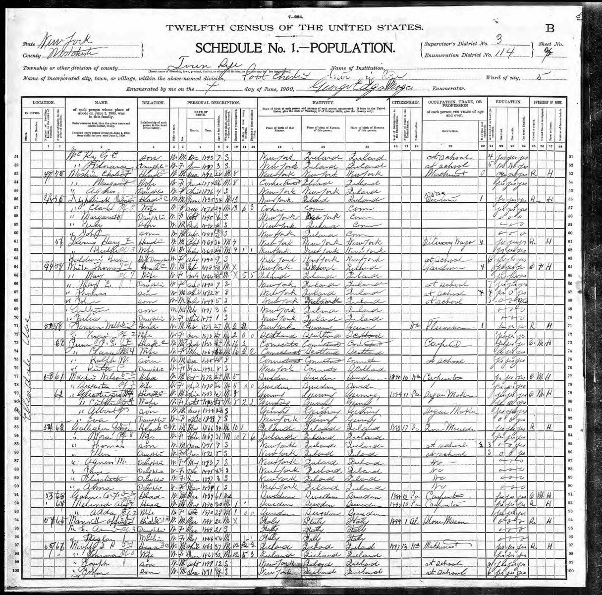 1900 U.S. census, Westchester County, New York, population schedule, Rye Township, enumeration district 114, p. 287-B [stamped], sheet 3 [penned], dwelling 49, family 58, Thomas White [Head]; digital images, Ancestry.com (www.ancestry.com : accessed 27 February 2015); citing NARA microfilm publication T623, roll 1177.