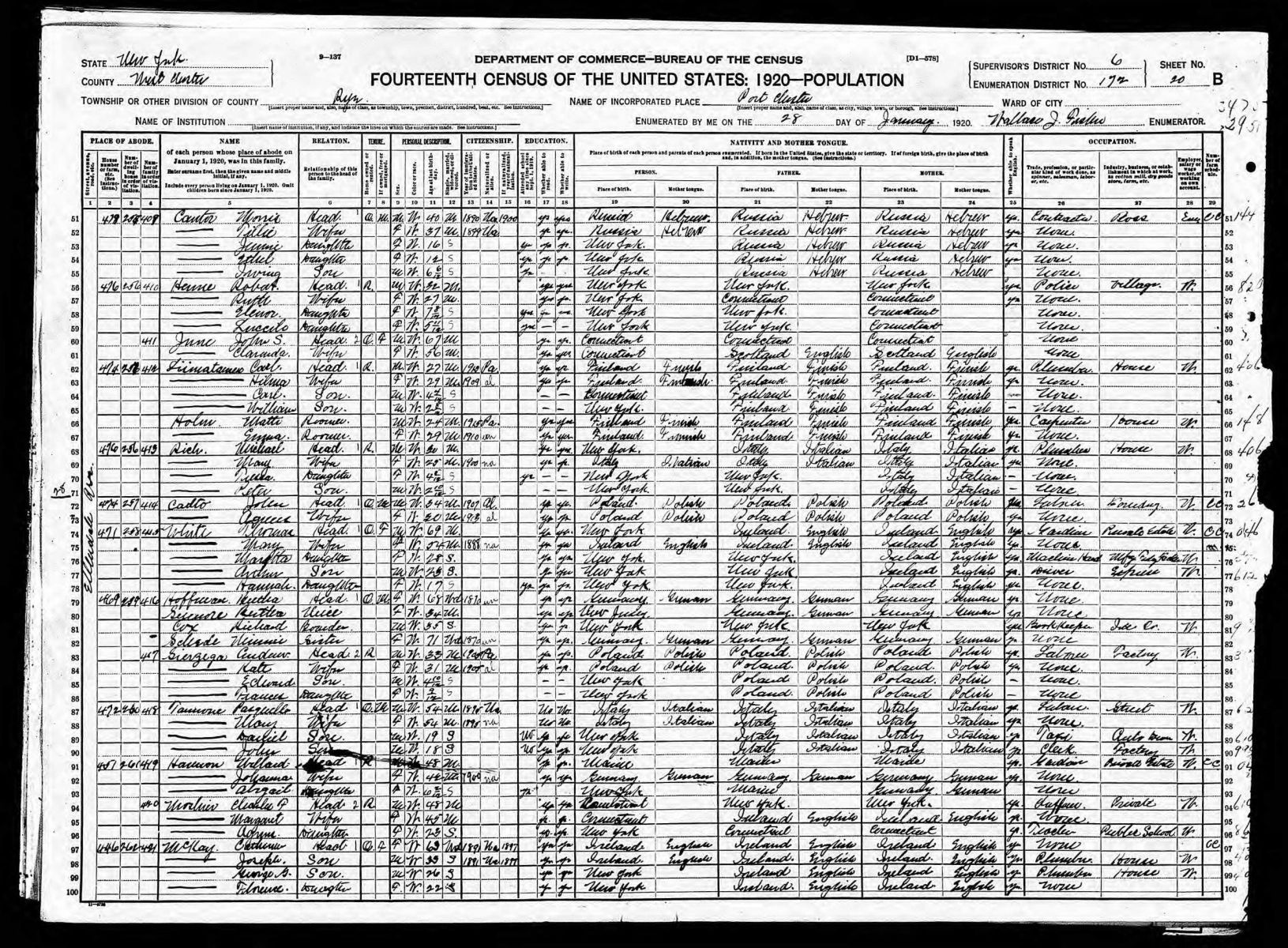 1920 U.S. census, Westchester County, New York, population schedule, Port Chester Village, enumeration district 172, p. [199]-B [stamped], sheet 20 [penned], 471 Ellendale Avenue, dwelling 258, family 415, Thomas White [Head]; digital images, Ancestry.com (www.ancestry.com : accessed 27 February 2015); citing NARA microfilm publication T625, roll 1278.