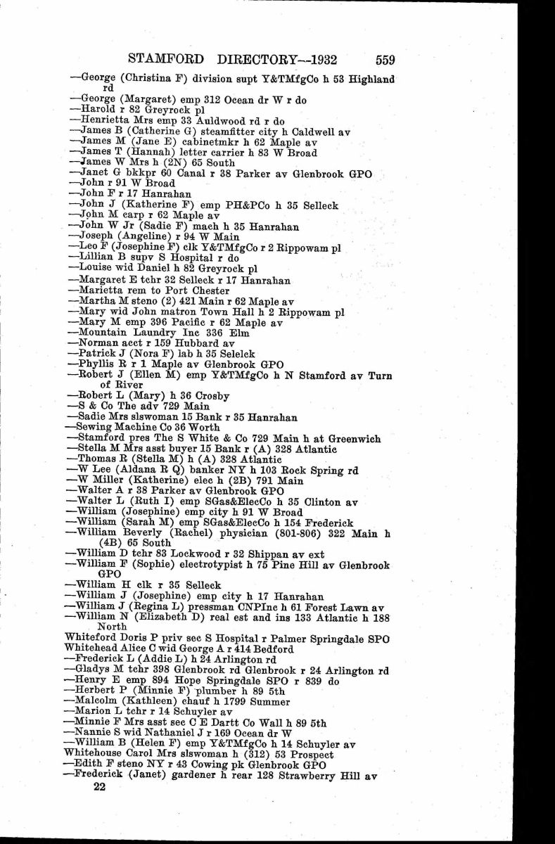 Stamford Directory (New Haven, Connecticut: The Price & Lee Co., 1926), 609, Marietta White, Weed Avenue [Springdale]; consulted as “U.S. City Directories, 1822-1995,” database and digital images, Ancestry.com (www.ancestory.com : accessed 24 May 2023); see subsequent years with varying titles: (1927) 657, (1928) 666, (1929) 697, (1930) 698, (1931) 742, (1932) 559.